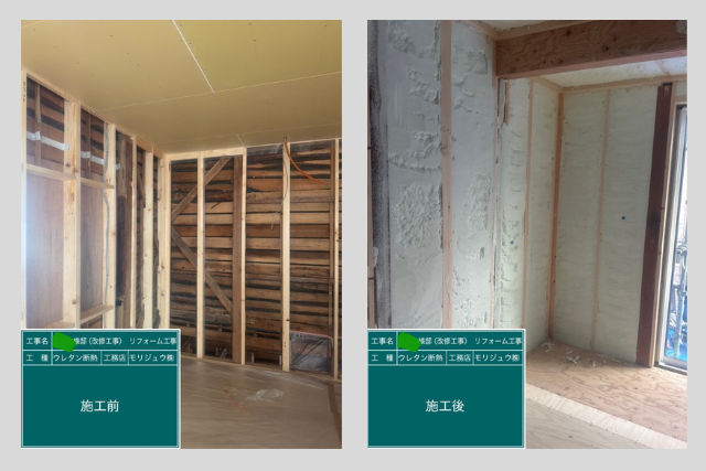 古い家にありがちな足元から底冷えする寒さも柱を残して、断熱材を施工することで新築と同様に断熱効果を上げることができます。