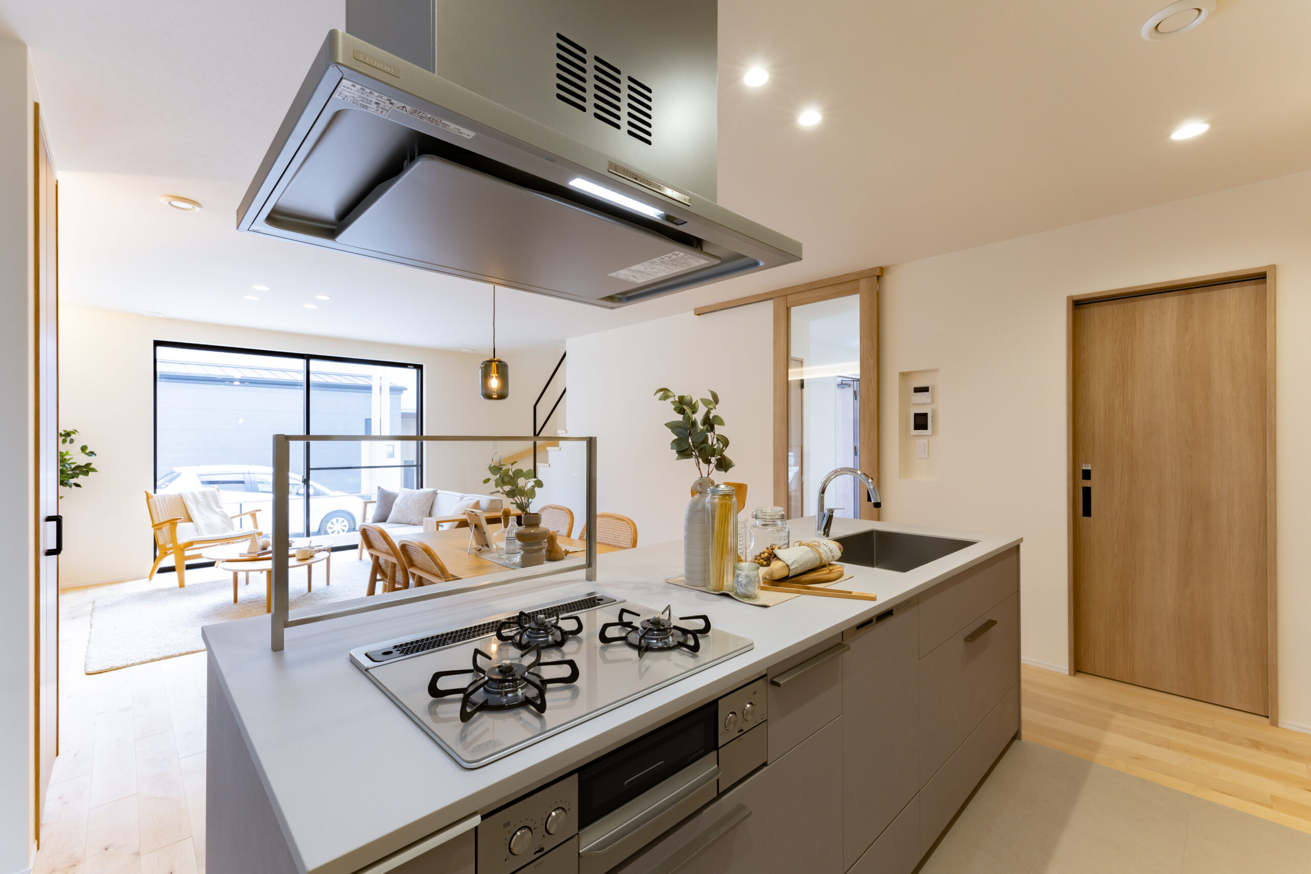 ライトグレーのアイランド型キッチンで効率的に家事ができる回遊型の家事動線です