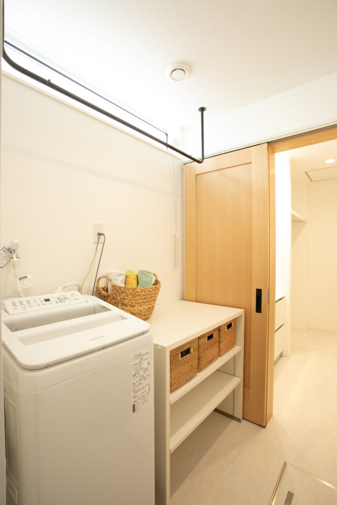 こちらは木目の建具と収納に合わせ、黒のアイアンバーを取り入れた洗濯室。