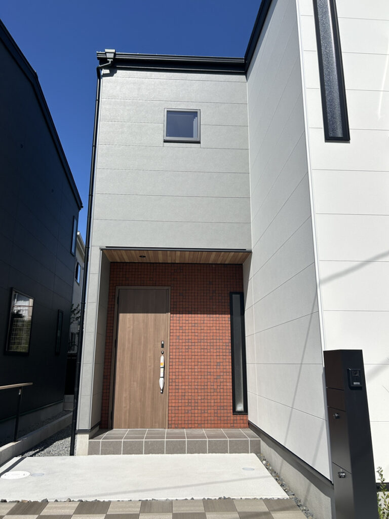 グレーとホワイトを基調とした外壁に、木目の軒天とナチュラルな玄関ドアを組み合わせることで、シンプルながらも温かみを感じるモダンな外観に仕上がりました。