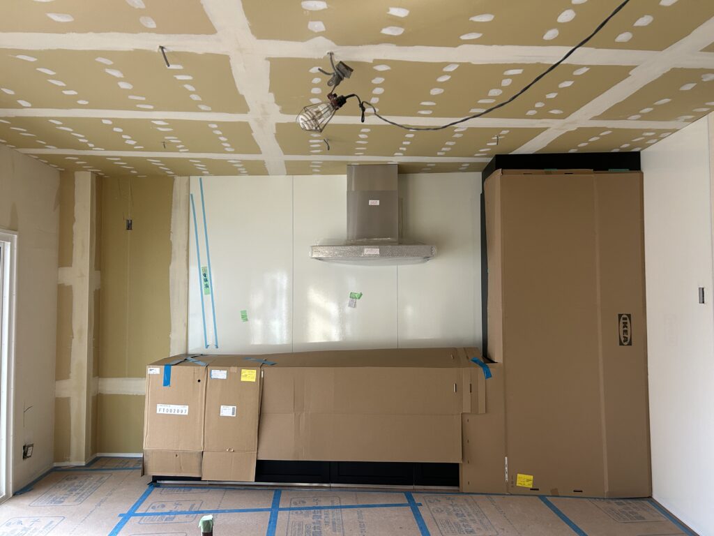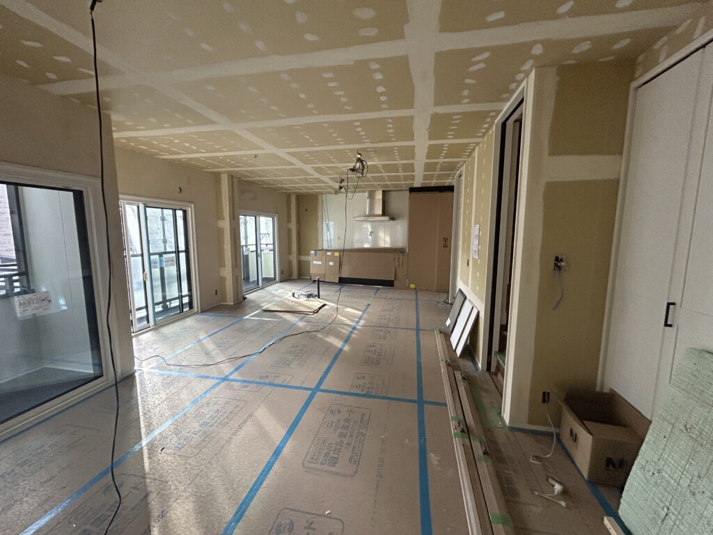 壁や天井もクロスを貼る前の下地の状態で、空間の広さや間取りは分かるものの、全体としてはまだ工事中という印象が強く残っています。