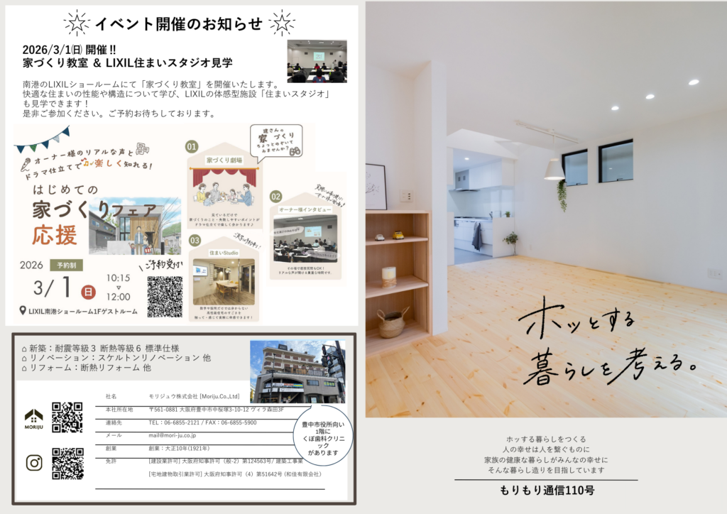 新築事業 リフォーム その他 その他 建設事業 不動産事業 建築家と造る家 施工事例 ニュース 会社情報 会社情報 会社概要・アクセス 代表挨拶・経営理念・基本方針 スタッフ紹介 沿革 採用情報 HOME 新築事業 リフォーム その他 建設事業 不動産事業 建築家と造る家 施工事例 ニュース 会社情報 会社概要・アクセス 代表挨拶・経営理念・基本方針 スタッフ紹介 沿革 採用情報 災害時の地域への貢献 お問い合わせ 新築事業TOP イベント情報 モリジュウが考える家づくり 安心/安全 健康 快適 工法と性能 ミドリノ ミドリノとは ミドリノの標準仕様 TRETTIO TRETTIOとは 選べるスタイル 施工事例 アフターメンテナンス お問い合わせ リフォーム事業TOP あなたの街のリフォーム屋さん モリジュウの強み よくある質問 性能向上リフォーム 断熱リフォーム 家探しからのリノベーション リノベの段どり/一括サポート リフォーム勉強会 お問い合わせ モリジュウ株式会社 大阪府豊中市中桜塚3-10-12 ヴィラ森田3F TEL.06-6855-2121営業時間:9:00~17:30 定休日:水曜日 NEWS ニュース トップ > ニュース > もりもり通信 > もりもり通信第110号 もりもり通信第110号 ニュース もりもり通信 2026.3.18 豊中市の注文住宅・リフォーム・リノベーション・不動産売買・学校改修工事は当社へお任せください。