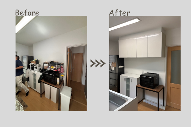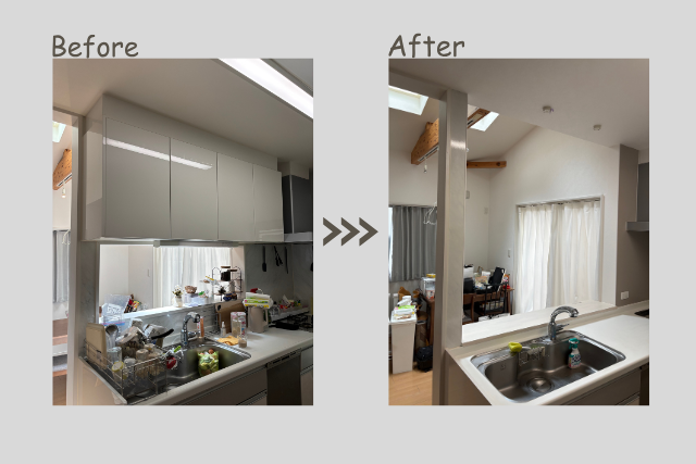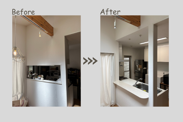 今回のリフォームでは、壁の撤去と収納の見直しによって、
